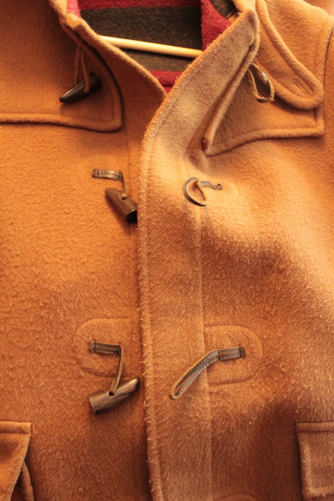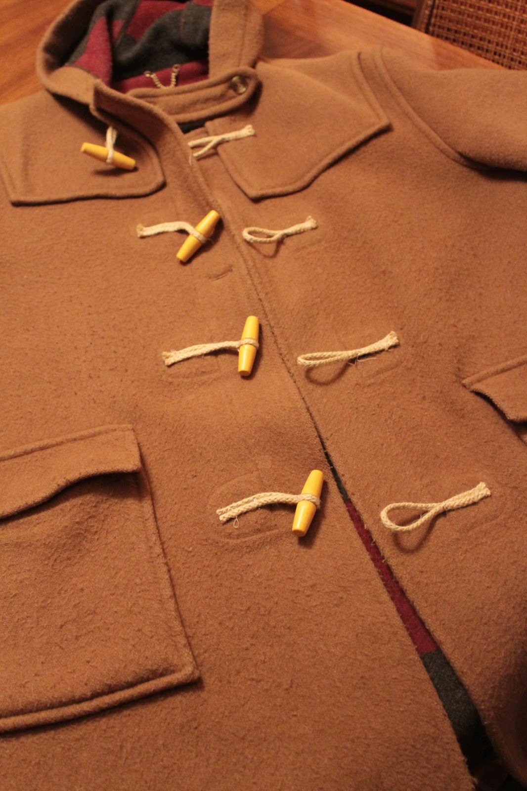 I've had this old Brooks Brothers duffle coat for a few years now. Originally picked up at a thrift shop (of course) for $12.99, it quickly became a favorite. I wear it a lot with jeans and sweaters, and over preppier jacket and tie combos involving tweeds, blazers, button down oxfords, cords, et cetera. The blanket lining keeps me warm, and the brownish shade of tan works well with anything. The only thing I never liked about it was the leather thong toggles and silly plastic "teeth", but I could live with it. But a real duffle coat ought to have rope and wood toggles.
