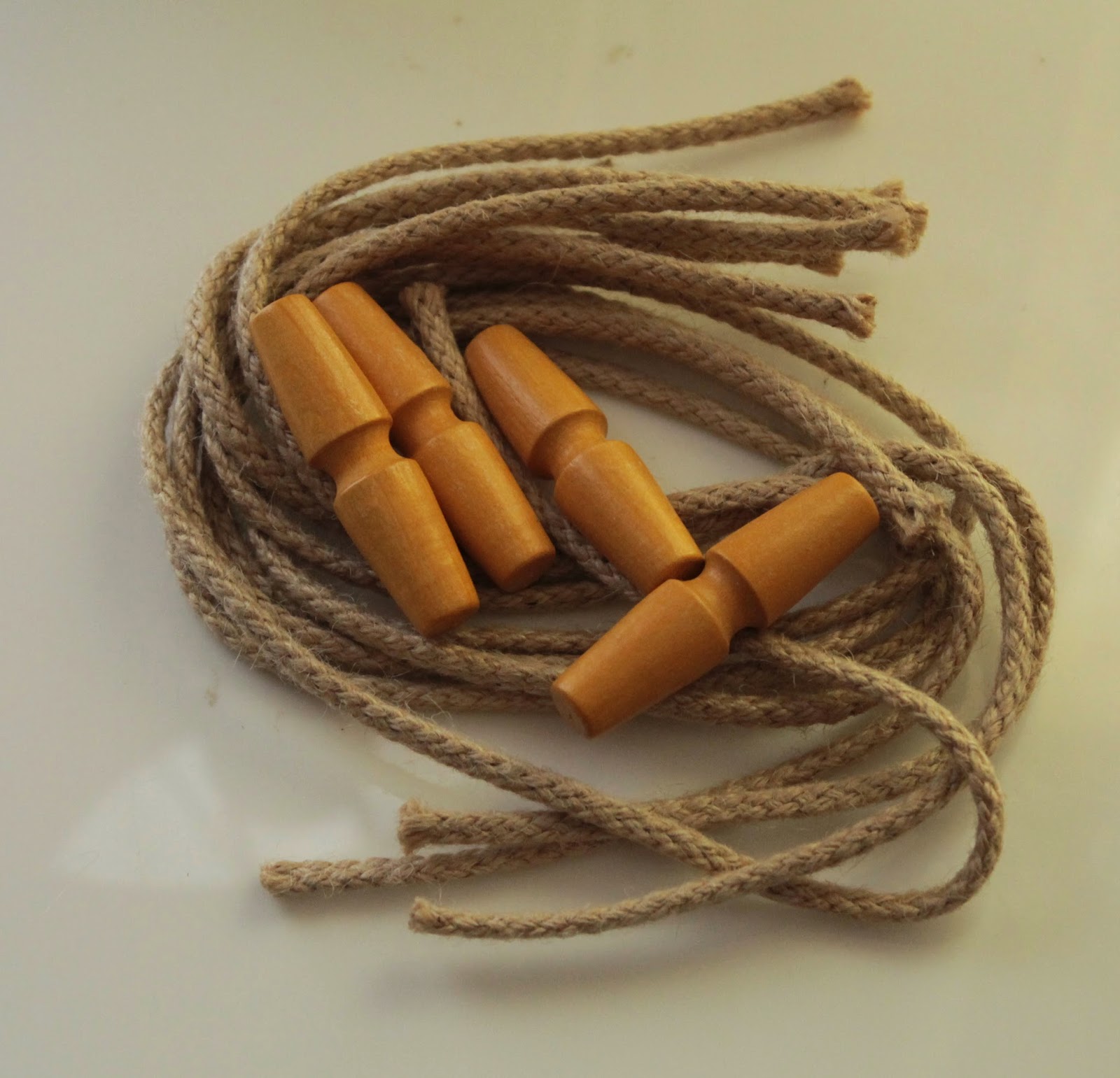 Fortunately, replacement sets can be ordered from Gloverall, the English manufacturer of these coats, for less than $10. I ordered a set over a month ago, and it arrived in short order. In the package are eight pieces of jute rope and four wooden toggles. I had hesitated about bringing the coat to the tailor to have the new toggles put on, mostly because I didn't want to be without the coat for a week or two in the middle of Winter. Then today we were snowed in, so I decided to have a go at it myself.